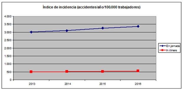 Las estadísticas de accidentes de trabajo que publica el Ministerio de Trabajo muestran que la incidencia de los accidentes in itinere es casi seis veces menor que la de los que ocurren en jornada de trabajo, como se muestra en la siguiente figura: