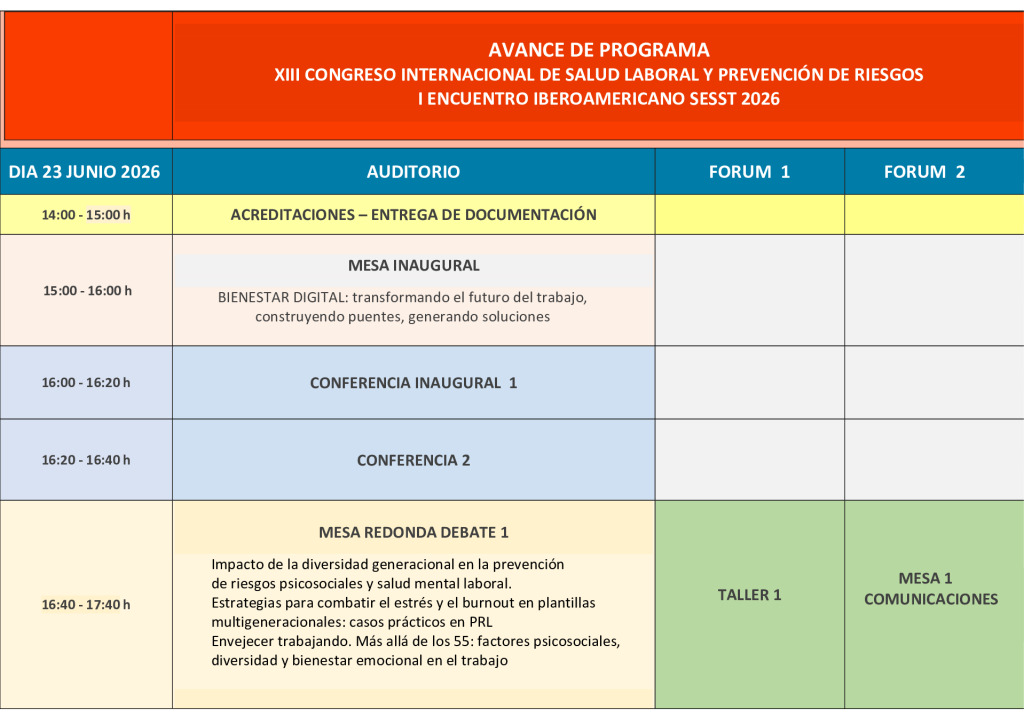 Ya está disponible el avance de programa del XIII Congreso Internacional de Salud Laboral y Prevención de Riesgos y del I Encuentro Iberoamericano SESST 2026. Puede consultarse y descargarse aquí: https://www.sesst.org/congreso-2026/#PROGRAMA