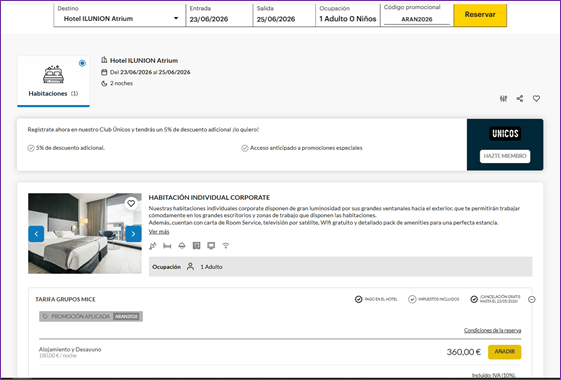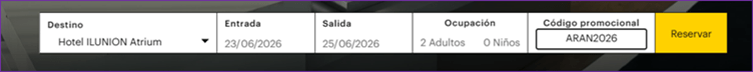 Utilizar el código ARAN2026 para reservas del 22 al 25 de junio en el Hotel ILUNION Atrium.