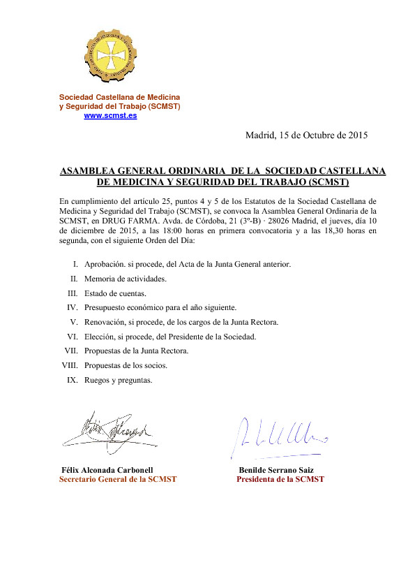 CONVOCATORIA DE LA ASAMBLEA GENERAL ORDINARIA DE LA SCMST el jueves 10 DE DICIEMBRE de 2015
