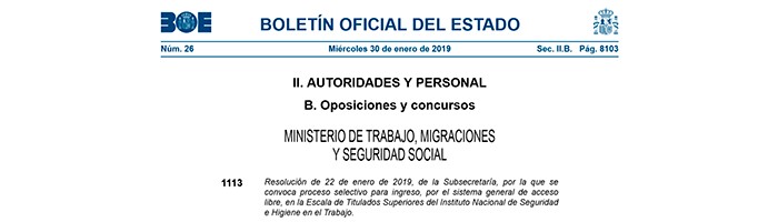 Se ha publicado en el BOE del miércoles 30 de enero Resolución de 22 de enero de 2019, de la Subsecretaría, por la que se convoca proceso selectivo para ingreso, por el sistema general de acceso libre, en la Escala de Titulados Superiores del Instituto Nacional de Seguridad e Higiene en el Trabajo.