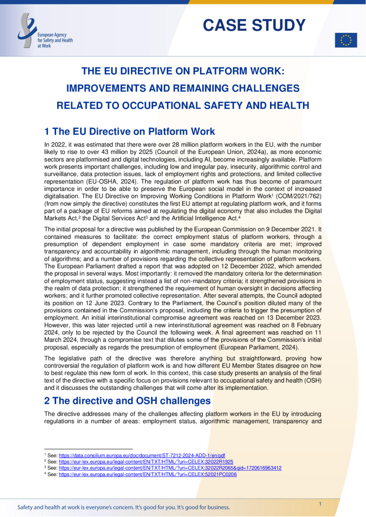 La Directiva de la UE sobre el trabajo en plataformas digitales: mejoras y retos pendientes relacionados con la seguridad y la salud en el trabajo | Safety and health at work EU-OSHA