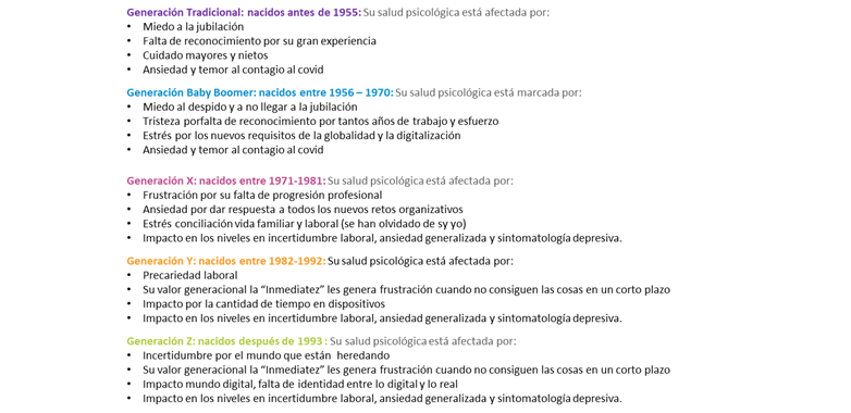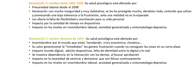 A nivel generacional, son los jóvenes de la generación Z y los Millennials, donde se observa igualmente, mayores niveles de incertidumbre laboral, ansiedad generalizada y sintomatología depresiva.