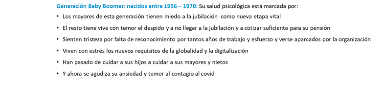 Por ultimo, la generación baby boomer presenta mayores niveles de ansiedad por miedo al contagio Covid19, como consecuencia directa de la situación vivida en la pandemia.