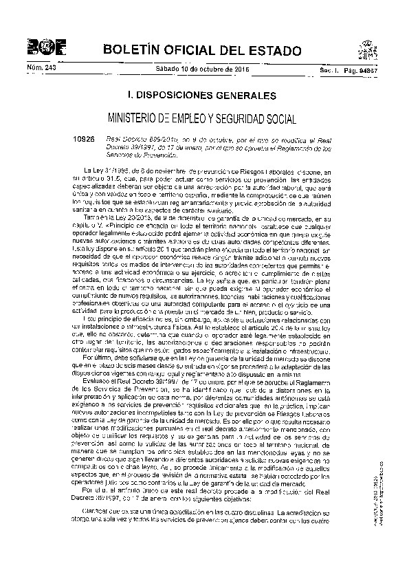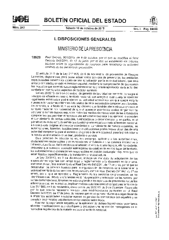 Real Decreto 901/2015 de 9 de octubre por el que se modifica el Real Decreto 84372011 de 17 de Junio por el que se establecen los criterios básicos sobre la organización de recursos para desarrollar la actividad sanitaria de los servicios de prevención