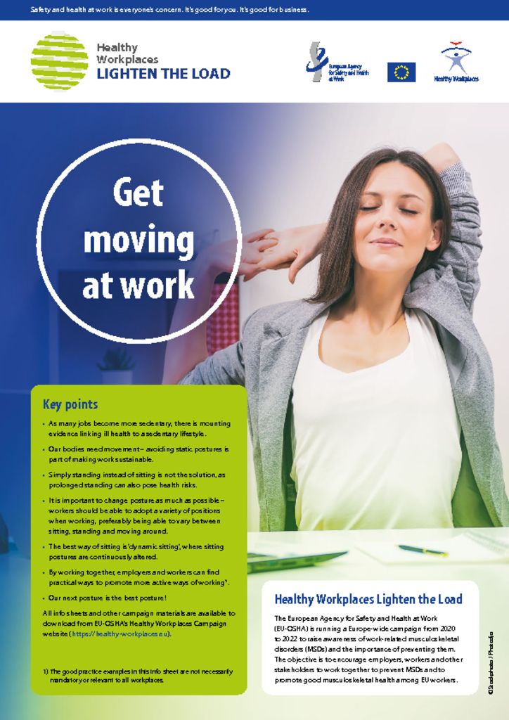 La breve guía pone de relieve los problemas musculoesqueléticos y otros problemas de salud asociados al trabajo sedentario, y explica qué pueden hacer las empresas y las personas trabajadoras para integrar el movimiento en sus costumbres laborales, proporcionando ejemplos reales de la vida laboral y enlaces a otros recursos.