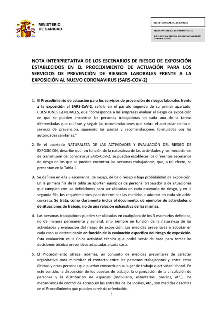 NOTA INTERPRETATIVA DE LOS ESCENARIOS DE RIESGO DE EXPOSICIÓN ESTABLECIDOS EN EL PROCEDIMIENTO DE ACTUACIÓN PARA LOS SERVICIOS DE PREVENCIÓN DE RIESGOS LABORALES FRENTE A LA EXPOSICIÓN AL NUEVO CORONAVIRUS (SARS‐COV‐2)