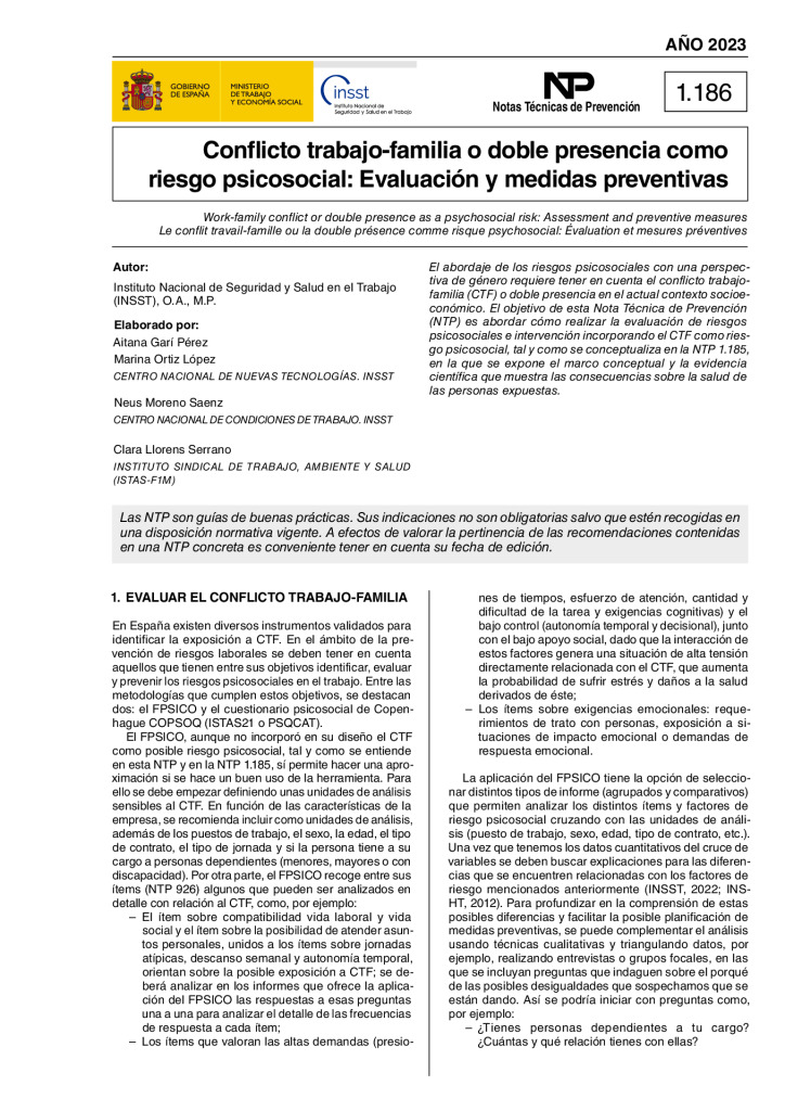 El objetivo de esta Nota Técnica de Prevención (NTP) es abordar cómo realizar la evaluación de riesgos psicosociales e intervención incorporando el CTF como riesgo psicosocial, tal y como se conceptualiza en la NTP 1.185, en la que se expone el marco conceptual y la evidencia científica que muestra las consecuencias sobre la salud de las personas expuestas.