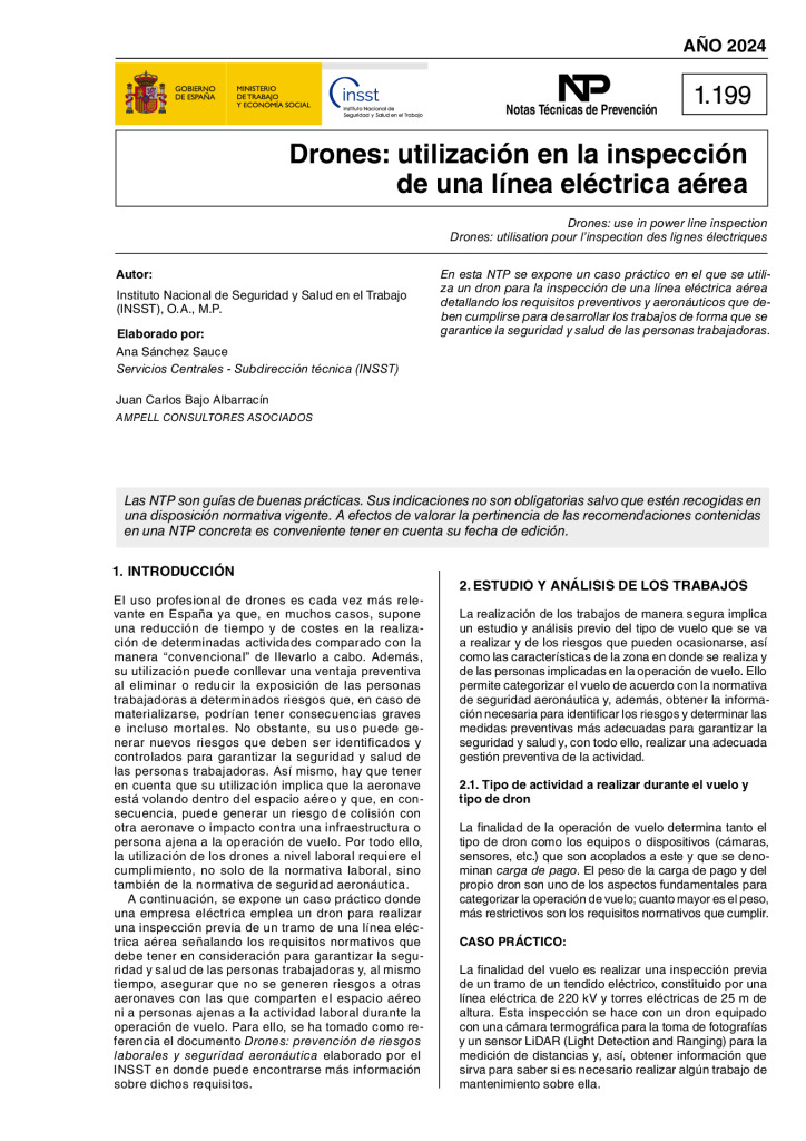 En esta NTP se expone un caso práctico en el que se utiliza un dron para la inspección de una línea eléctrica aérea detallando los requisitos preventivos y aeronáuticos que deben cumplirse para desarrollar los trabajos de forma que se garantice la seguridad y salud de las personas trabajadoras