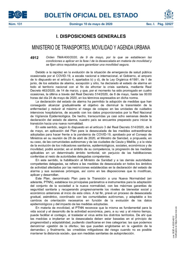 BOE, número 131, a través del cual se publica Orden TMA/400/2020, de 9 de mayo, por la que se establecen las condiciones a aplicar en la fase I de la desescalada en materia de movilidad y se fijan otros requisitos para garantizar una movilidad segura.