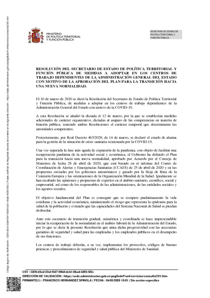 Resolución del Secretario de Estado de Política Territorial y Función Pública de medidas a adoptar en los centros de trabajo dependientes de la administración general del estado con motivo de la aprobación del plan para la transición hacia una nueva normalidad.