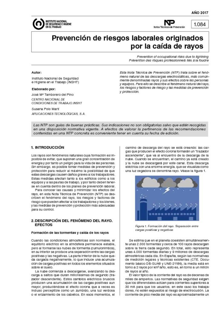 Esta Nota Técnica de Prevención (NTP) trata sobre el fenómeno natural de las descargas electrostáticas, más comúnmente denominadas rayos y sus efectos sobre las personas y equipos. Para ello se describe el fenómeno natural del rayo, los riesgos y factores de riesgo y las medidas de prevención y protección