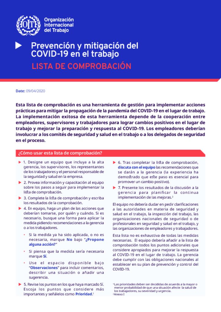 Se adjunta Archivo y Enlace al documento publicado por la OIT el 16/04/2020 “Prevención y mitigación del COVID-19 en el trabajo LISTA DE COMPROBACIÓN