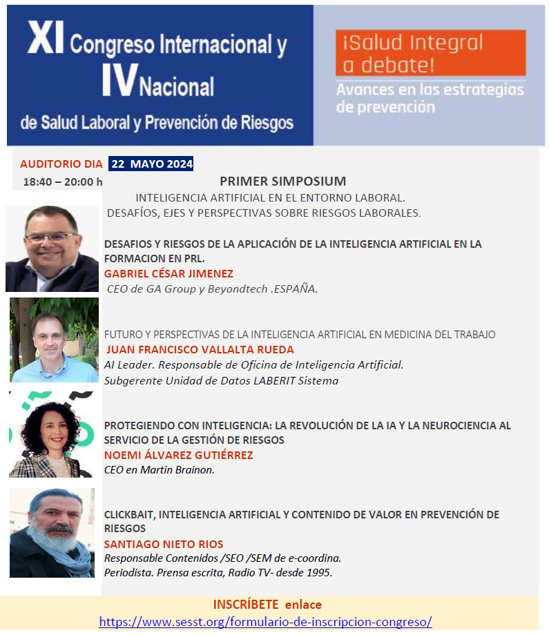 PRIMER SIMPOSIUM INTELIGENCIA ARTIFICIAL EN EL ENTORNO LABORAL. DESAFÍOS, EJES Y PERSPECTIVAS SOBRE RIESGOS LABORALES2024-04-152024-04-13https://www.sesst.org/wp-content/uploads/2018/06/logo-sesst.pngSOCIEDAD ESPAÑOLA DE SALUD Y SEGURIDAD EN EL TRABAJOhttps://www.sesst.org/wp-content/uploads/2024/04/primersimposium-22demayo.jpg200px200px