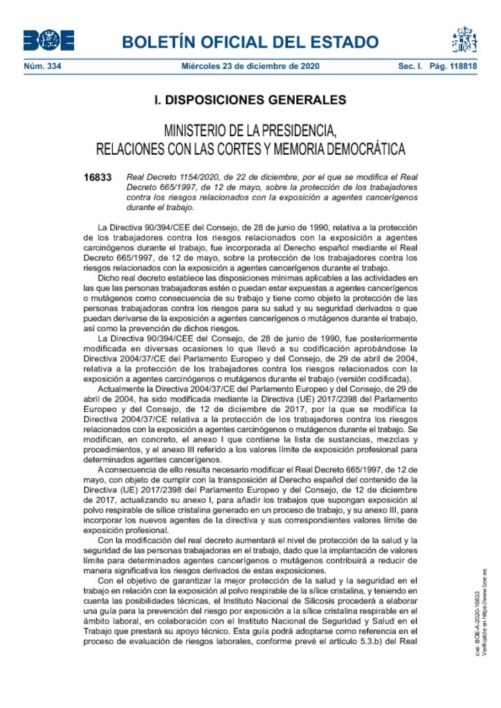 Publicado Real Decreto 1154/2020, de 22 de diciembre, por el que se modifica el Real Decreto 665/1997, de 12 de mayo, sobre la protección de los trabajadores contra los riesgos relacionados con la exposición a agentes cancerígenos durante el trabajo (23/12/20)