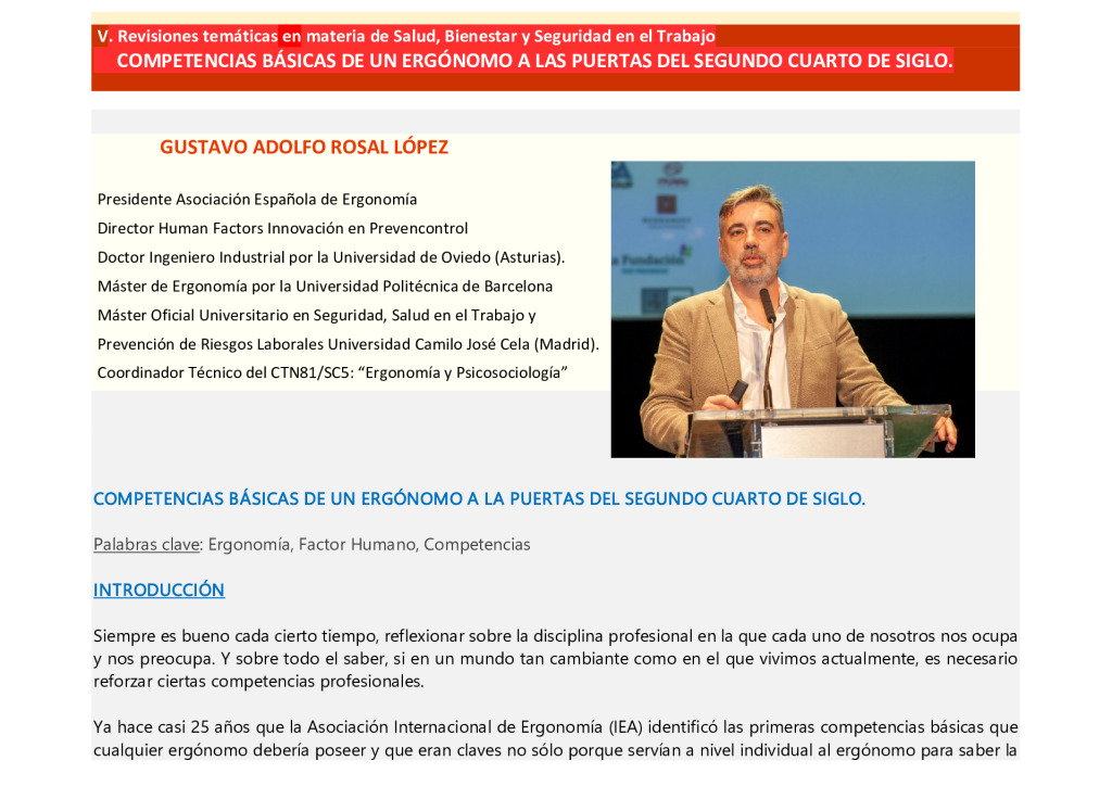 Revisiones temáticas en materia de Salud, Bienestar y Seguridad en el Trabajo : COMPETENCIAS BÁSICAS DE UN ERGÓNOMO A LAS PUERTAS DEL SEGUNDO CUARTO DE SIGLO.