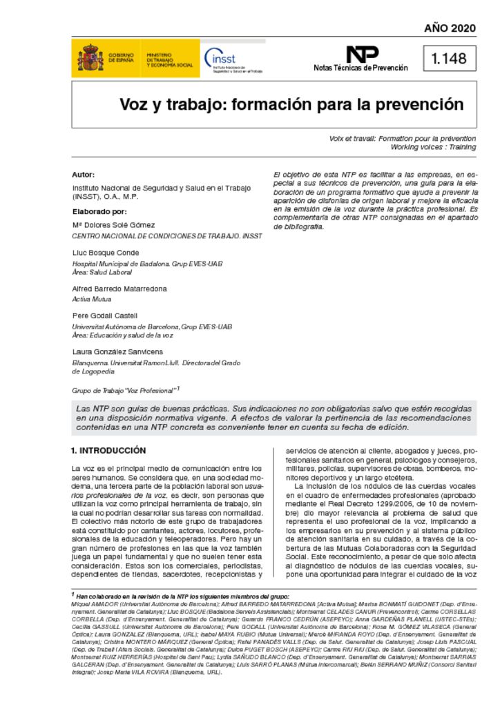 El objetivo de esta NTP es facilitar a las empresas, en especial a sus técnicos de prevención, una guía para la elaboración de un programa formativo que ayude a prevenir la aparición de disfonías de origen laboral y mejore la eficacia en la emisión de la voz durante la práctica profesional. Es complementaria de otras NTP consignadas en el apartado de bibliografía.